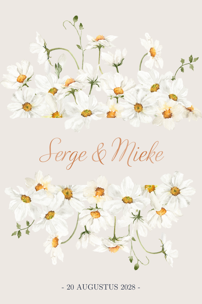 Waterverf save the date kaart met witte margrietjes en jullie namen in hoogglans. Op de achterzijde van deze enkele kaart met ronde hoeken kun je je eigen tekst plaatsen. Pas dit ontwerp zelf aan in onze editor. Deze save the date kaart past bij diverse trouwkaarten waar dezelfde witte margrietjes op zijn gebruikt.