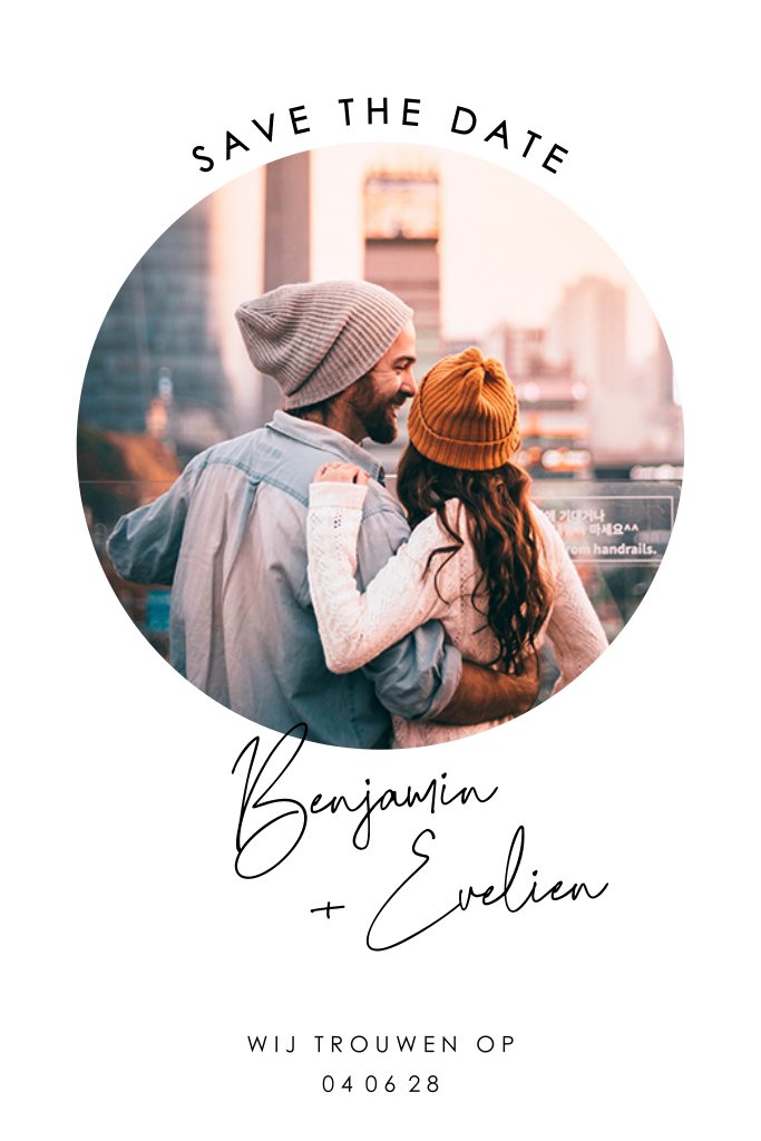 Mooie strakke save the date kaart met ronde foto en stijlvolle typografie. Achterop staat ook nog een ronde foto. Je kunt een foto via 'volgorde' in de designtool onderop plaatsen zodat de cirkel zichtbaar wordt. De voorbeeldfoto kun je dan verwijderen.