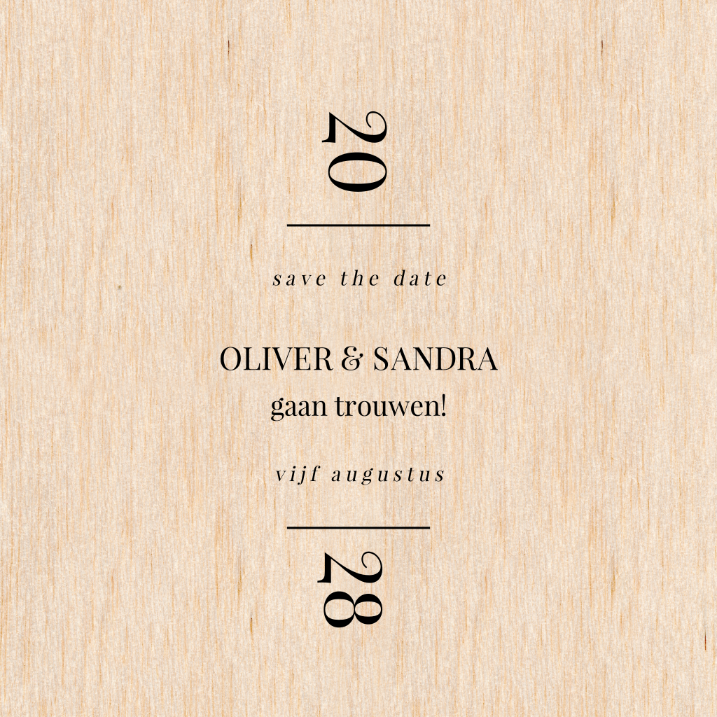 Origineel save the date kaartje van écht hout met typografisch ontwerp. Een minimalistisch ontwerp om jullie gasten alvast uit te nodigen voor jullie trouwdag. Pas dit ontwerp zelf aan in onze editor.