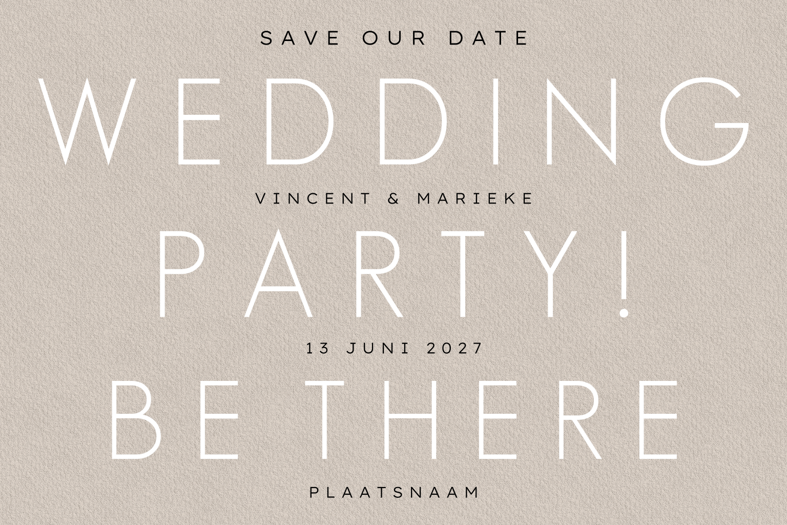 Op zoek naar een typografische save the date kaart om jullie bruiloft aan te kondigen? Wat vind je van deze hippe kaart met in roségoudfolie de tekst: 'Wedding party! Be there'. Achterop kun je alle overige tekst kwijt of eventueel een mooie foto. Pas de save the date eenvoudig aan in de editor.