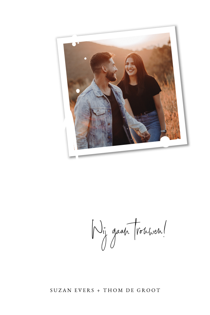 Ben je ten huwelijk gevraagd en is inmiddels de trouwdatum vastgelegd? Stuur dan deze vrolijke Wij gaan trouwen kaart naar al je familie en vrienden die je er zeker bij wilt hebben op deze mooie dag. Een trendy ontwerp met eigen foto, roségouden spetters en in het groot 'Yes'. De roségouden details en typografie worden gedrukt in foliedruk en springen dus heel mooi van het papier af!