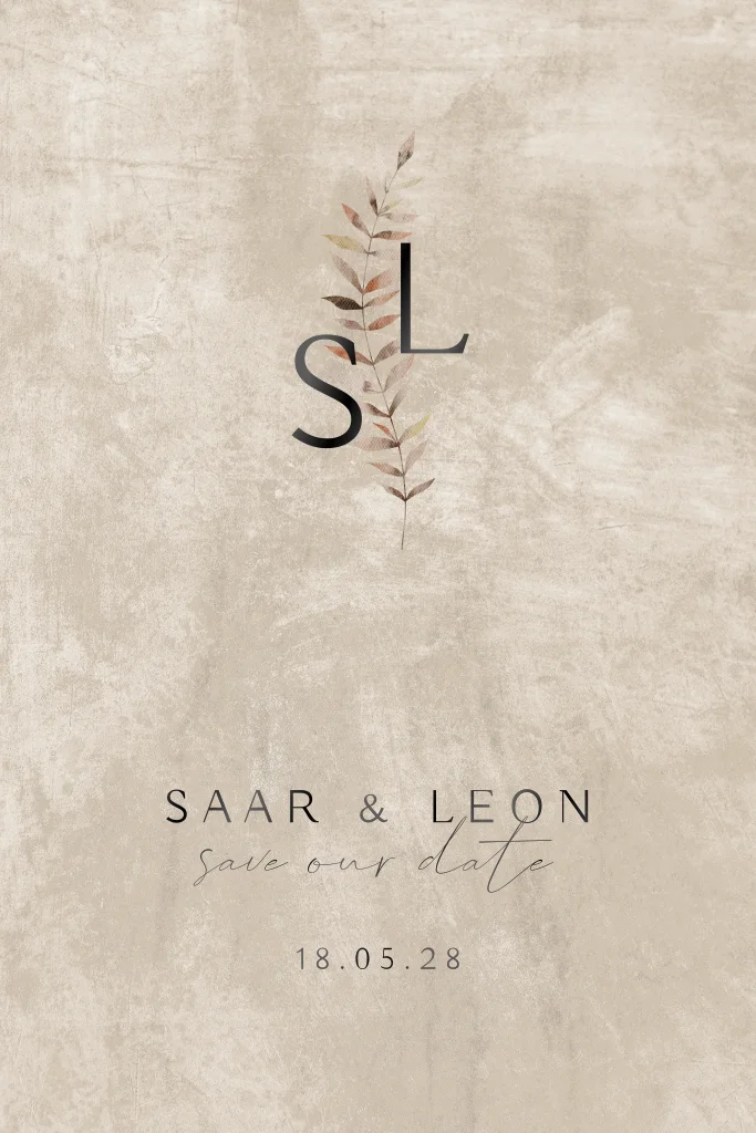Rustige en minimalistische save the date met hoogglans initialen en afgeronde hoeken. De achtergrond heeft een neutrale kleur en een mooie textuur. De subtiele illustratie van blaadjes maakt deze kaart helemaal af. Op de achterzijde is ruimte voor een persoonlijk bericht en jullie gegevens. Pas deze save the date kaart zelf aan in onze handige editor en bestel een proefdruk.