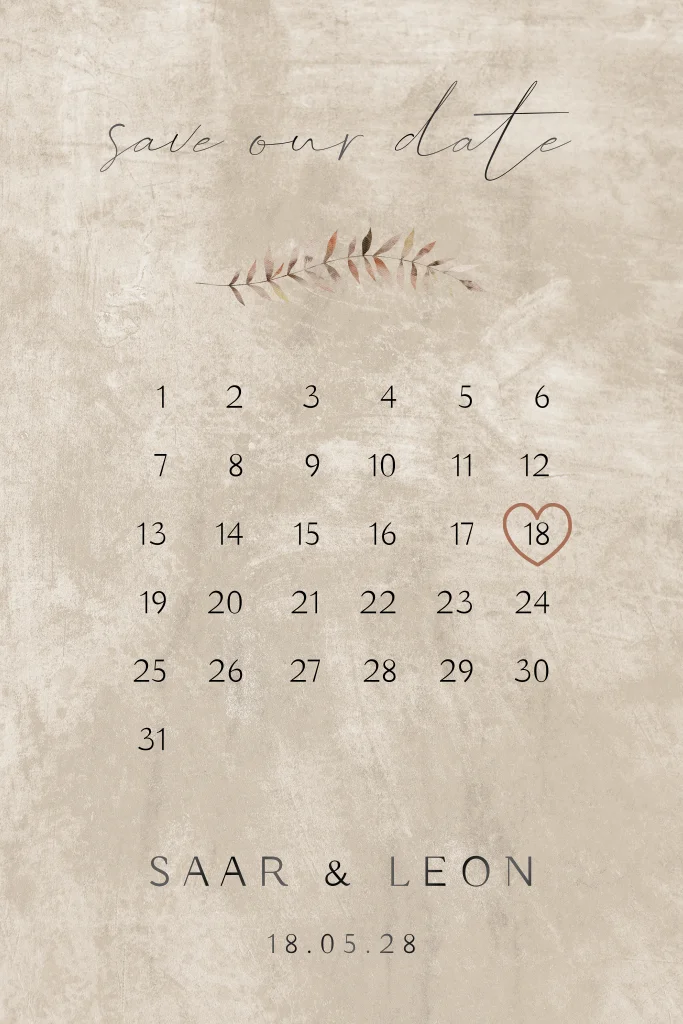 Rustige beige save the date met kalender met de trouwdatum omcirkeld. De achtergrond heeft een neutrale kleur met een mooie textuur. Het blaadje maakt deze kaart helemaal af. Op de achterzijde is ruimte voor een persoonlijk bericht en jullie gegevens. Pas deze save the date kaart zelf aan in onze handige editor en bestel een proefdruk.