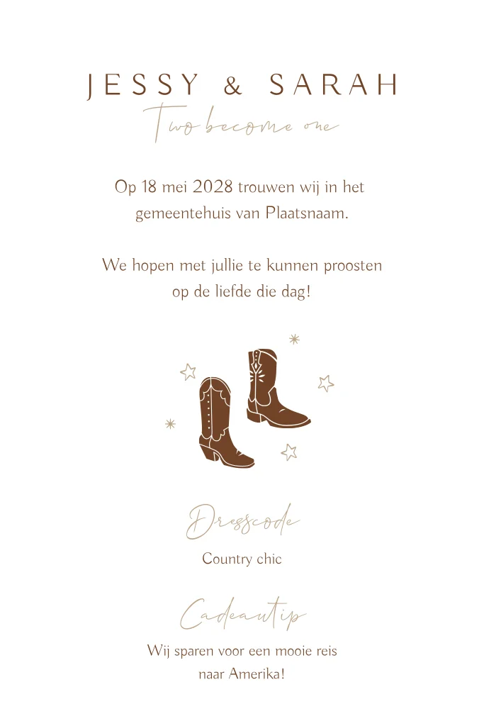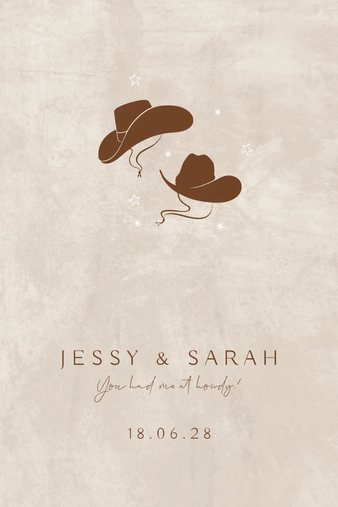Uitnodiging voor een huwelijk in ware country western stijl! Deze prachtige trouwkaart met beige achtergrond en donkerbruine typografie heeft een rustieke uitstraling. Op de voorkant staan twee stoere cowboyhoeden met kleine witte sterretjes er omheen. Aan de binnenkant staan twee cowboylaarzen. Pas de kaart naar wens aan met de editor en bestel een drukproef om het ontwerp in het echt te zien.