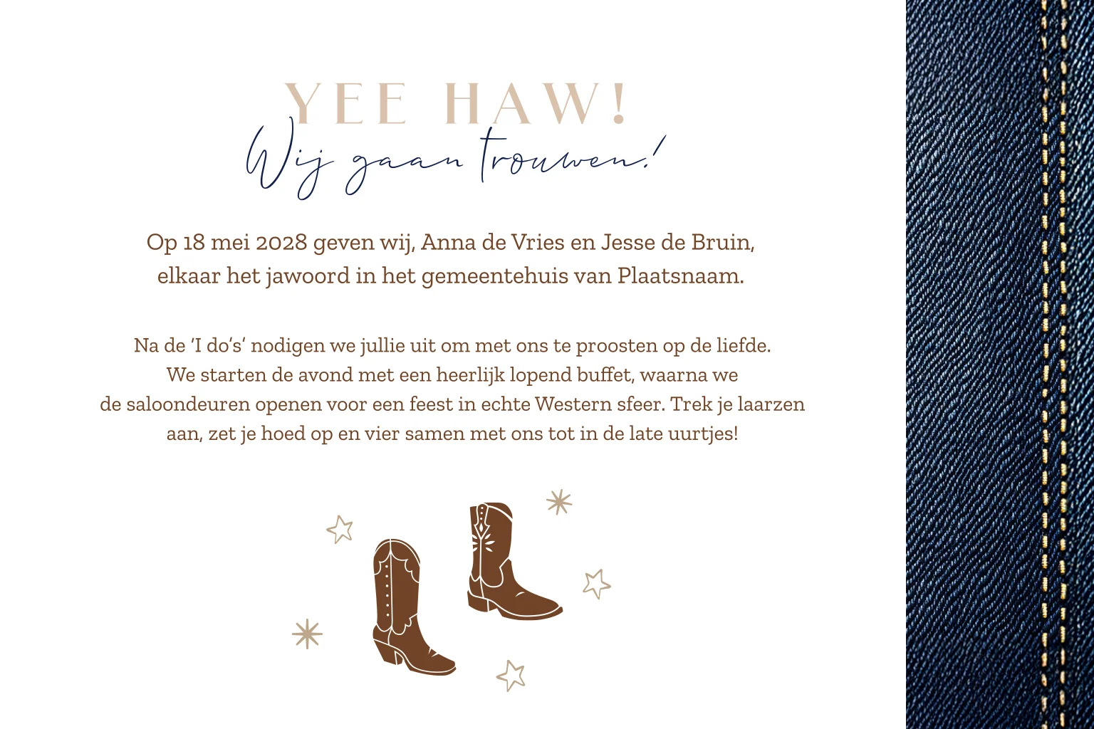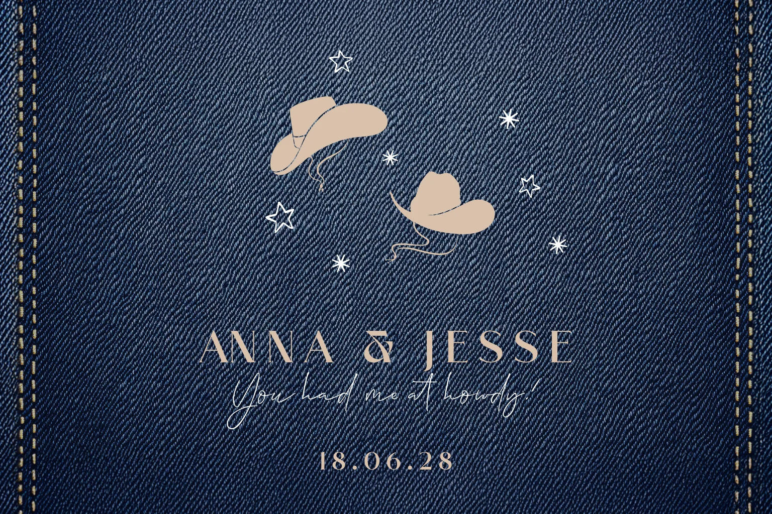 Vier jullie liefde in echte Western stijl met deze unieke denim trouwkaart. De kaart heeft een stoere jeanslook met contrasterend stiksel, versierd met cowboyhoeden en sterren. De tekst "You had me at howdy!" geeft direct de sfeer van jullie Western bruiloft weer. Perfect voor een themafeest met cowboyhoeden, laarzen en countrymuziek. Personaliseer eenvoudig in onze online editor en maak deze Western trouwkaart helemaal eigen.