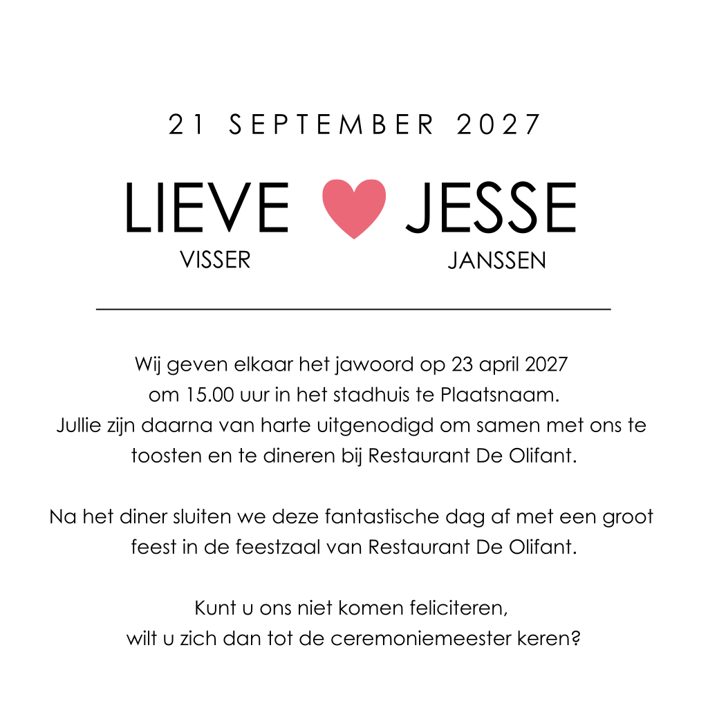 Zoeken jullie een beetje ewaagd ontwerp voor jullie trouwkaart? Deze zwarte krijtbord trouwkaart met hippe typografie is zeker opvallend. De zwarte krijtbord achtergrond met tekst in verschillende lettertypes geeft de kaart een stoere uitstraling. Deze teksten kun je eenvoudig zelf aanpassen met de designtool. Bestel een drukproef om een gedrukte versie in het echt te zien voordat je de oplage gaat bestellen.