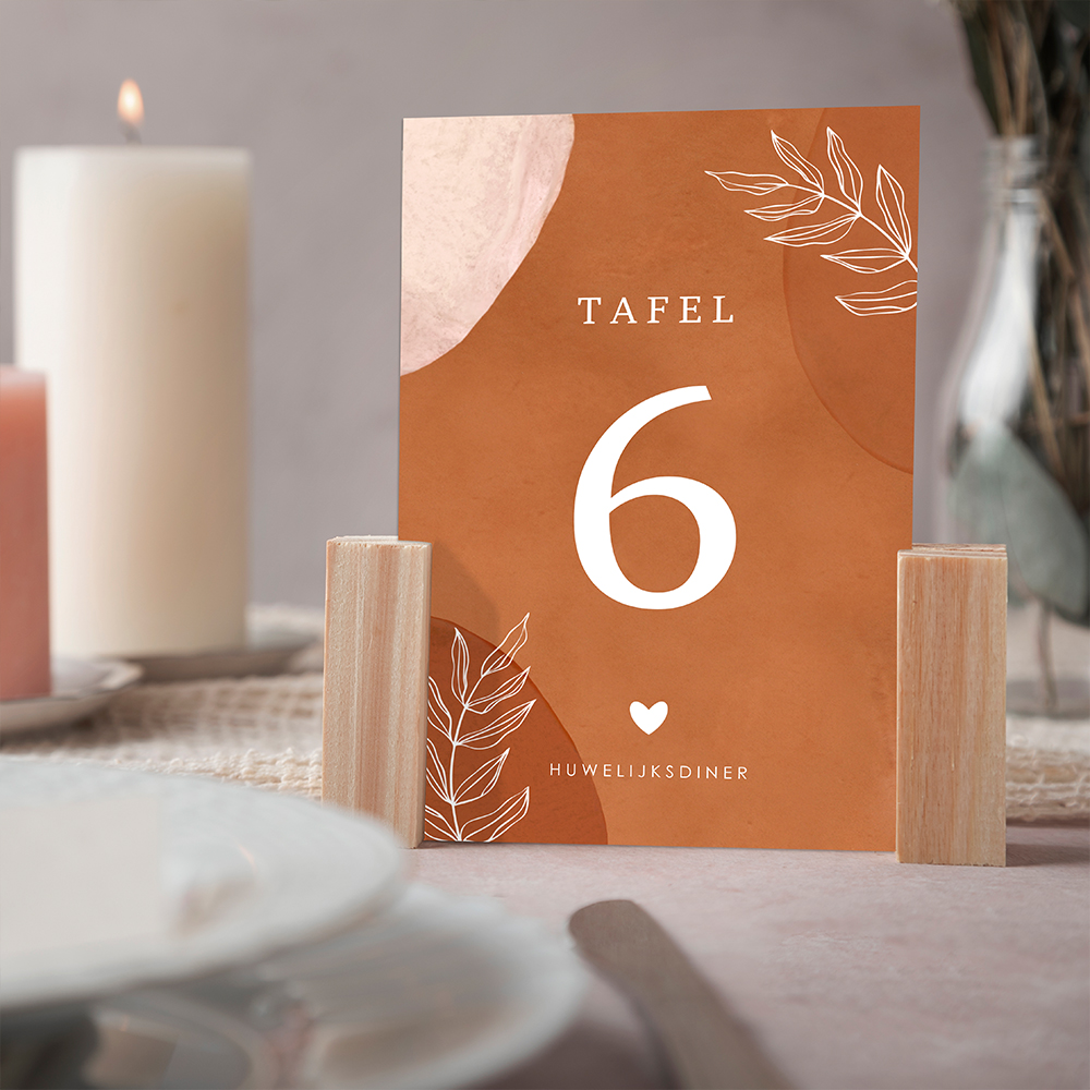Dit mooie tafelnummerkaartje passend bij deze roestrode trouwkaart kun je gebruiken om op tafel te zetten tijdens het huwelijksdiner. De nummers kun je zelf eenvoudig op de kaart aanpassen. Heb je één kaartje af? Kopieer deze dan onder je account en maak eerst alle tafelkaartjes op. Je kunt ze dan één voor één via 'verder winkelen' toevoegen aan je bestelling.