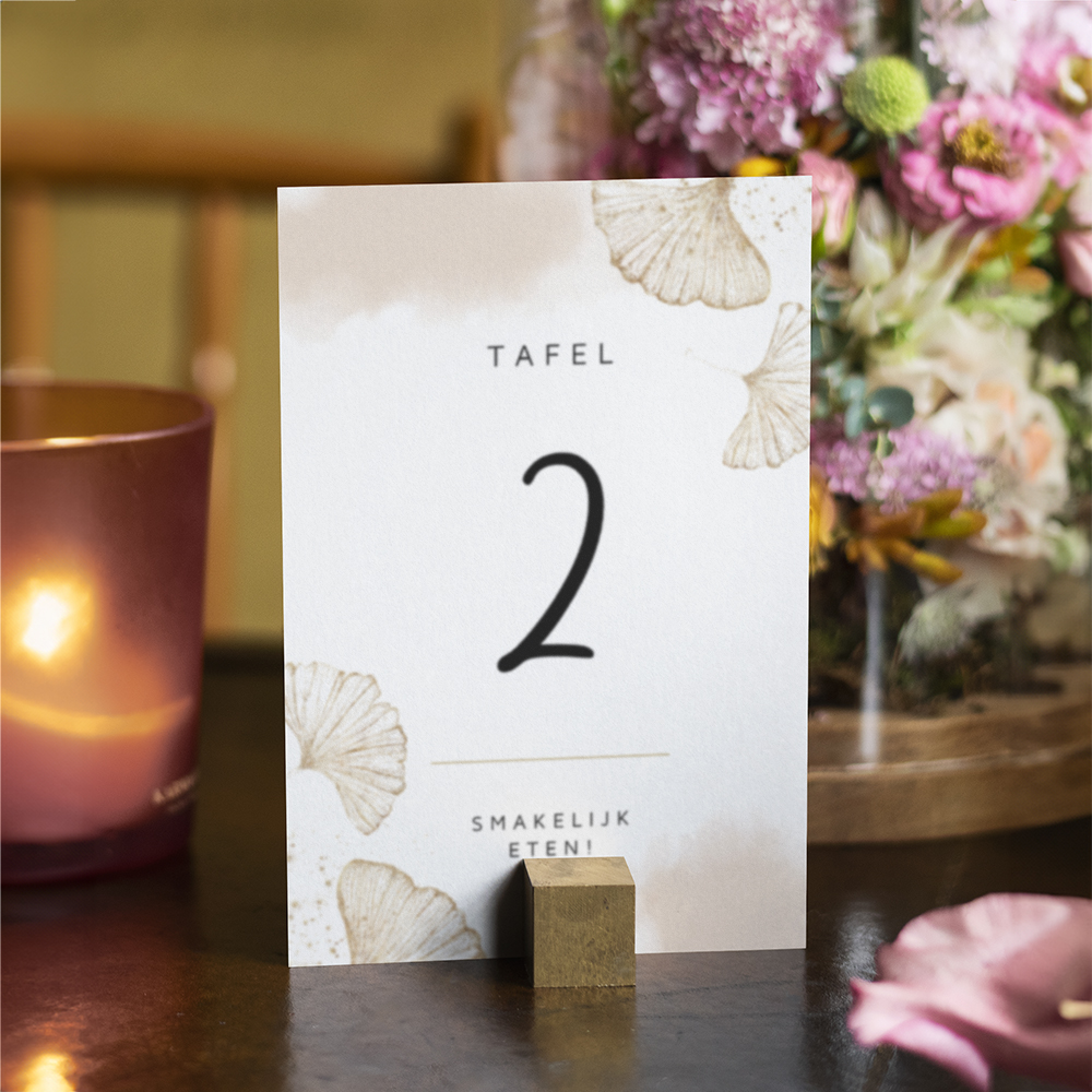 Stijlvolle tafelnummerkaartje met ginkgo bladeren en roze waterverf. Bij je huwelijksdiner laat je natuurlijk niets aan het toeval over. Maak de tafelnummerkaartjes voor je tafelindeling in dezelfde stijl als je trouwkaart met gouden ginkgo bladeren. Zo ziet de dinertafel er helemaal af uit. Pas dit ontwerp eenvoudig naar smaak aan in onze ontwerptool. Je kunt zelf in de designtool de cijfers eenvoudig aanpassen.