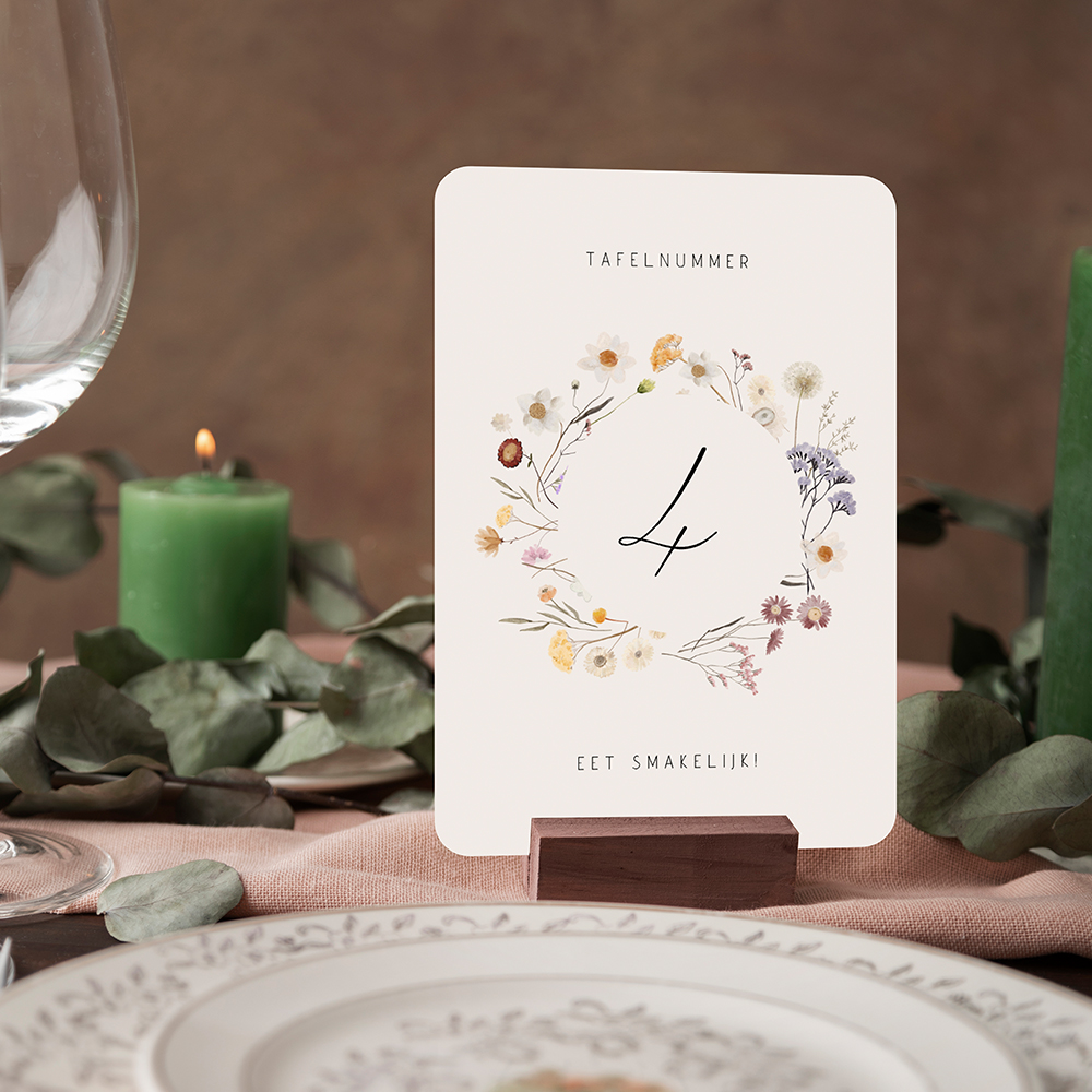Beige tafelnummerkaart met wilde bloemenkrans en sierlijke typografie. Plaats dit kaartje op de tafels tijdens jullie huwelijksdiner om deze helemaal in stijl af te maken. Deze tafelnummerkaartjes passen bij de trouwkaart 'Beige trouwkaart met wilde bloemenkrans'.