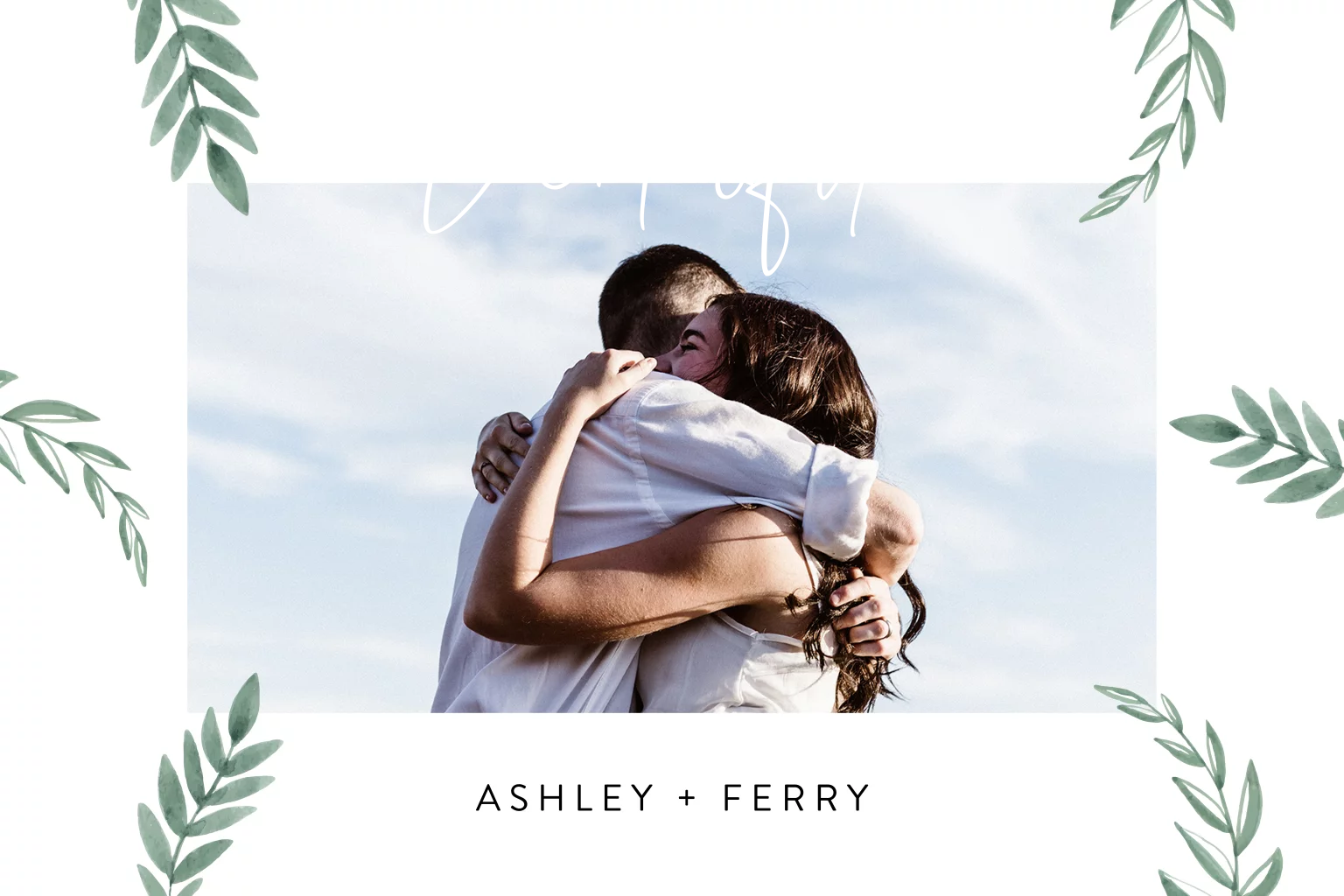 Verlovingskaart met mooie eigen foto, getekende takjes en goudfolie. Zijn jullie onlangs verloofd? Gefeliciteerd, dat verdient een feestje. Maak met deze verlovingskaart jullie aanstaande huwelijk bekend bij vrienden en familie en nodig ze uit om dit samen met jullie te vieren. Deze stijlvolle verlovingskaart met goudfolie is omringd door bladeren en heeft een grijsgroene achterkant.
