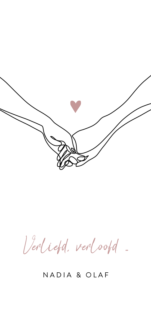 Minimalistische verlovingskaart met lijntekening van handen en roze hartje. Ben je op zoek naar een kaart om jullie verloving mee aan te kondigen? Ga dan voor dit langwerpige kaartje met een monoline van twee handen die elkaar vasthouden. Een simpel ontwerp, maar door de lieve tekening en zachtroze details toch een romantische verlovingskaart. Bestel een proefdruk om te zien hoe dit ontwerp er gedrukt uit komt te zien.