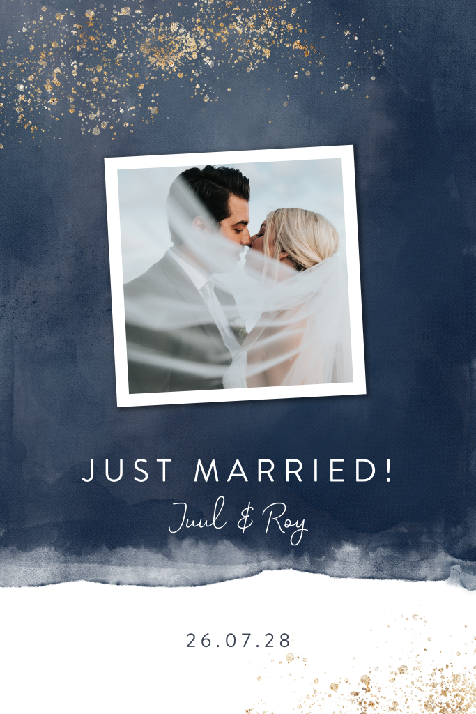 Zijn jullie onlangs getrouwd? Verstuur deze chique wij zijn getrouwd kaart. Dit enkele kaartje heeft donkerblauwe waterverf als achtergrond en een wit fotokader voor een mooie foto van jullie bruiloft. De goudkleurige spetters zorgen voor de finishing touch. Pas de kaart naar wens aan en bestel een drukproef.