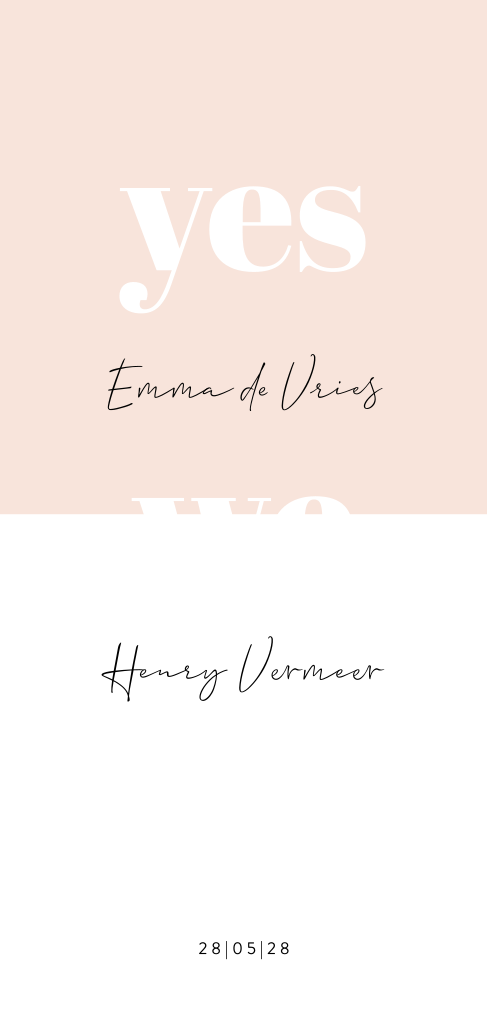 Zijn jullie stiekem getrouwd en wil je dat de kennissenkring in stijl laten weten? Kies dan voor deze stijlvolle wij zijn getrouwd kaart met goudfolie en roze vlak. Op de voorkant staat met dikke letters 'yes we did'. Op de achterkant is ruimte voor een persoonlijke boodschap en de eventuele uitnodiging voor een feest. Pas de kleuren en lettertypes naar wens aan en bestel een drukproef.