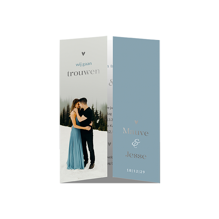 Deze winterse theaterkaart s perfect voor een bruiloft in december of in de sneeuw. De ijsblauwe voorzijde toont jullie namen in stijlvolle typografie met een subtiel hartje en zilver, terwijl de linkerflap ruimte biedt voor een romantische winterfoto. Bij het openen ontvouwt zich de complete uitnodiging, gepresenteerd in het midden. Een unieke theaterkaart die je in de kaartenmaker eenvoudig personaliseert.