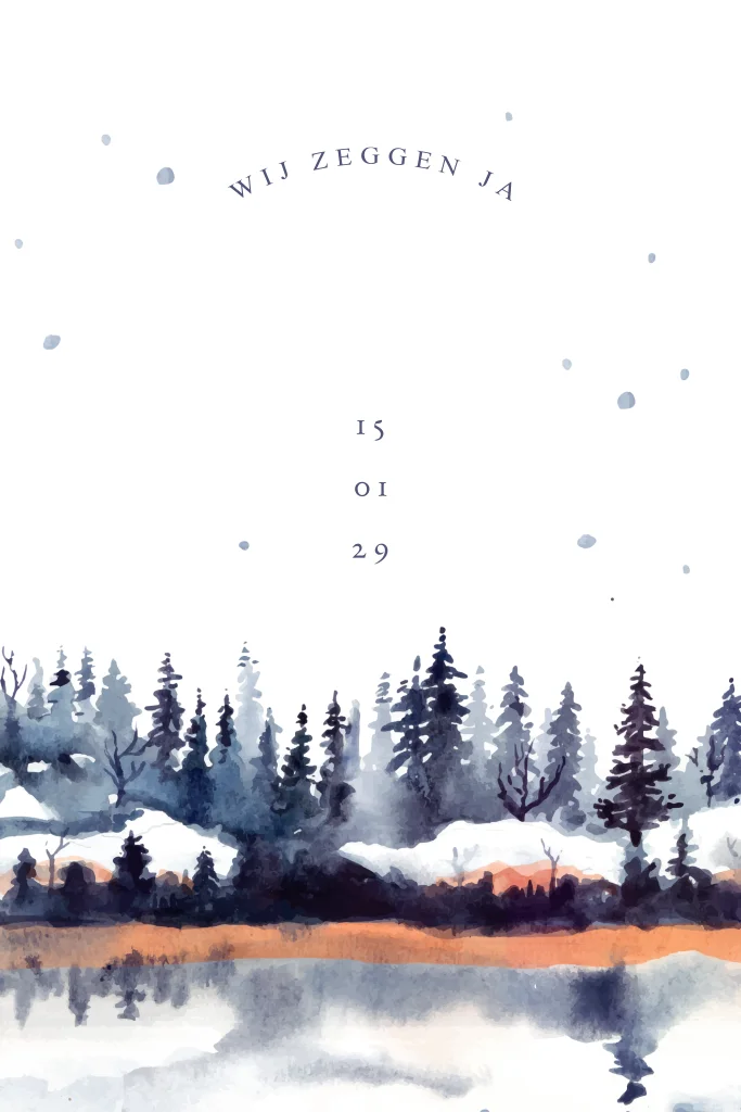 Romantische trouwkaart met winters landschap in waterverf en koperfolie typografie. Aan de voor- en binnenzijde van deze dubbele kaart staan aquarel illustraties van dennenbomen in de sneeuw. Jullie namen komen voorop in koperfolie. Een perfecte uitnodiging voor jullie winterse bruiloft! Pas deze trouwkaart zelf aan in onze ontwerptool.