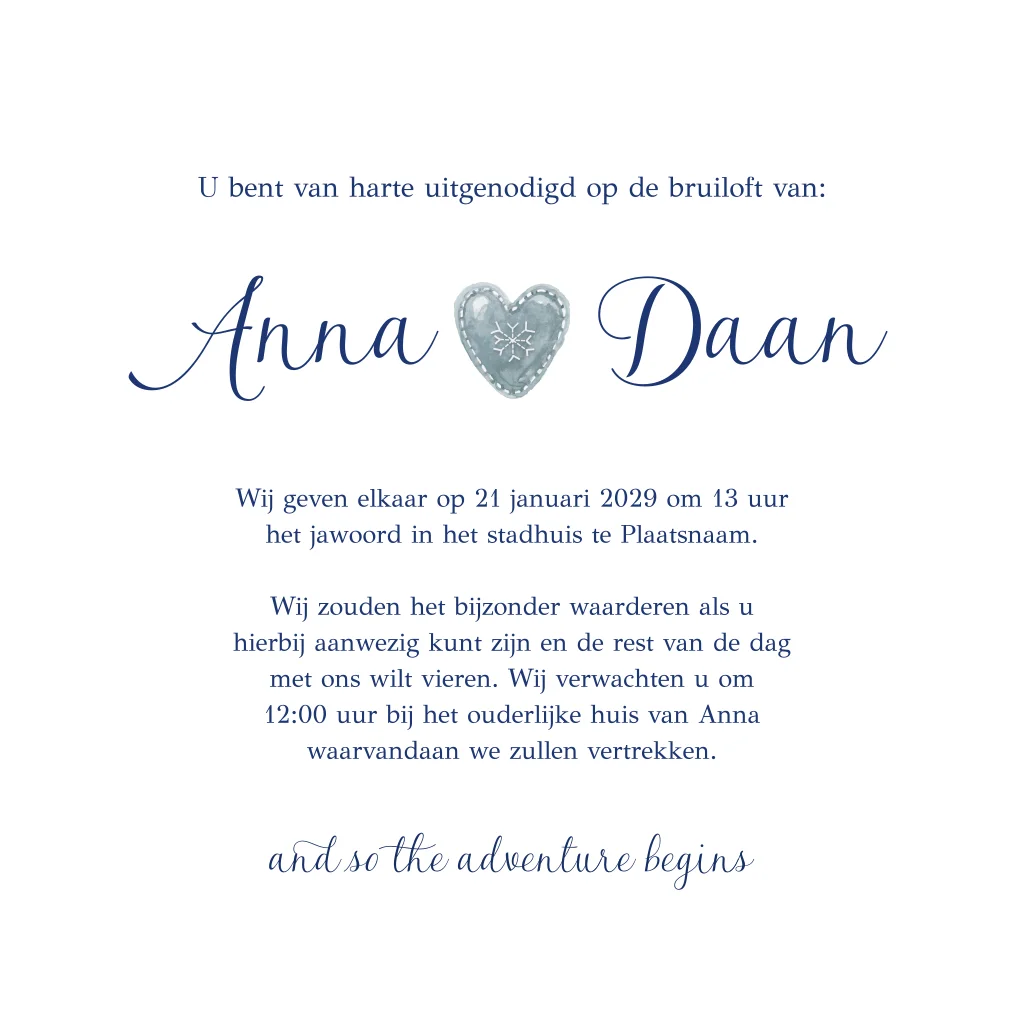 Deze winterse trouwkaart straalt warmte uit met een sfeervolle aquarel van besneeuwde dennenbomen. Perfect voor een winterbruiloft, waarbij de natuur en zachte kleuren de romantische toon zetten. Personaliseer de kaart eenvoudig met jullie namen en datum, en vraag direct een drukproef aan om het resultaat te bekijken. Maak jullie winterse huwelijk compleet met deze unieke trouwkaart.