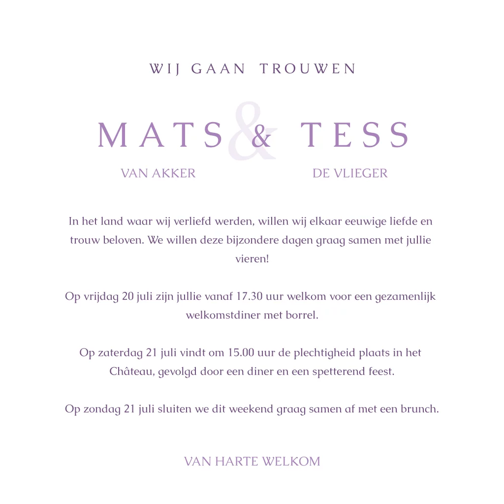Deze kaart is perfect voor een bruiloft in Frankrijk, waarbij de natuurlijke pracht van de Provence en de romantiek van lavendelvelden het toneel vormen voor een onvergetelijke dag. Met onze online tool kun je de kaart eenvoudig personaliseren en een proefdruk aanvragen om het ontwerp eerst in het echt te zien.