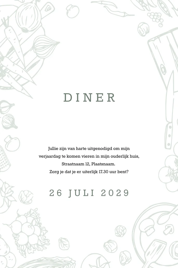 Hippe uitnodiging voor een 21 diner. De kaart wordt omrand door verschillende illustraties van eten. Een speelse koperfolie 21 staat groot in het midden van de kaart. Op de achterzijde kun je de eventuele dresscode en cadeautip kwijt. Zo nodig jij je vrienden of vriendinnen in stijl uit op je 21 diner.