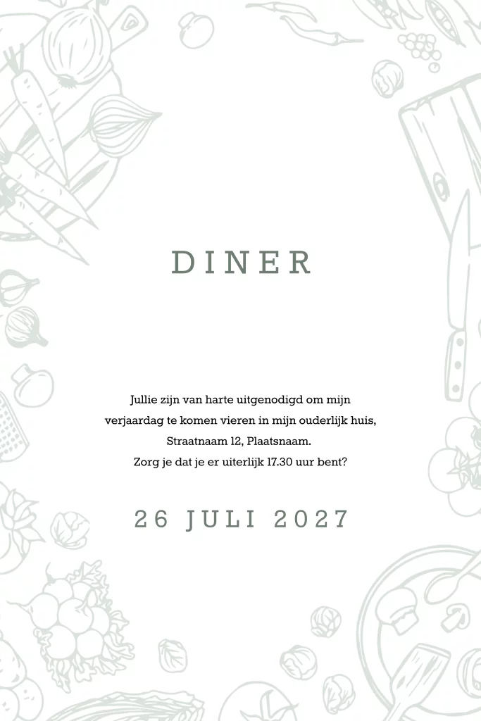 Hippe uitnodiging voor een 21 diner. De kaart wordt omrand door verschillende illustraties van eten. Een speelse goudfolie 21 staat groot in het midden van de kaart. Op de achterzijde kun je de eventuele dresscode en cadeautip kwijt. Zo nodig jij je vrienden of vriendinnen in stijl uit op je 21 diner.