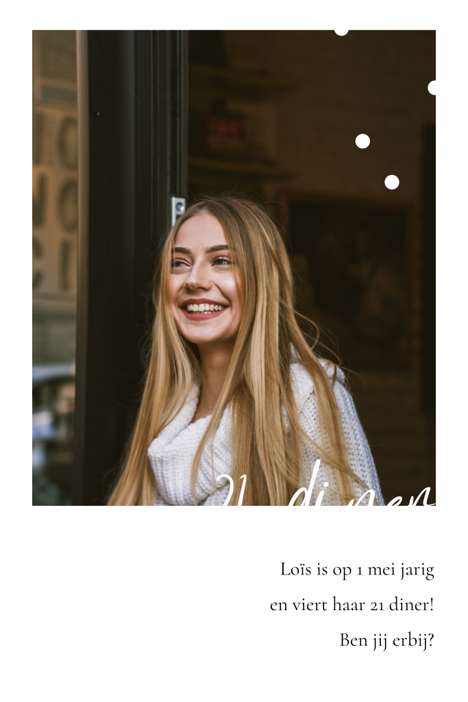 Je wordt 21, alvast gefeliciteerd! Deze mijlpaal moet natuurlijk groots gevierd worden. Een 21 diner is een goede manier om stil te staan bij deze bijzondere leeftijd. Nodig al je vrienden uit met dit vrolijke kaartje in polaroid vorm. In het kader kun je een leuke foto van jezelf plaatsen. De goudfolie confetti en sierlijke typografie maken dit kaartje helemaal af.