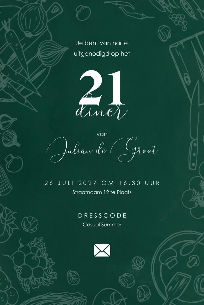 Chique uitnodiging met een diepgroene achtergrond. De kaart heeft een rand van verschillende illustraties die allemaal met eten te maken hebben. De sierlijke tekst wordt met goudfolie gedrukt wat prachtig kleurt bij de groene achtergrond. Met chique, dikke cijfers staat er groot 21 in het midden. Met deze stijlvolle uitnodiging nodig je al je vrienden uit voor een heerlijk 21 diner bij jou thuis. Pas naar wens aan en bestel een drukproef.