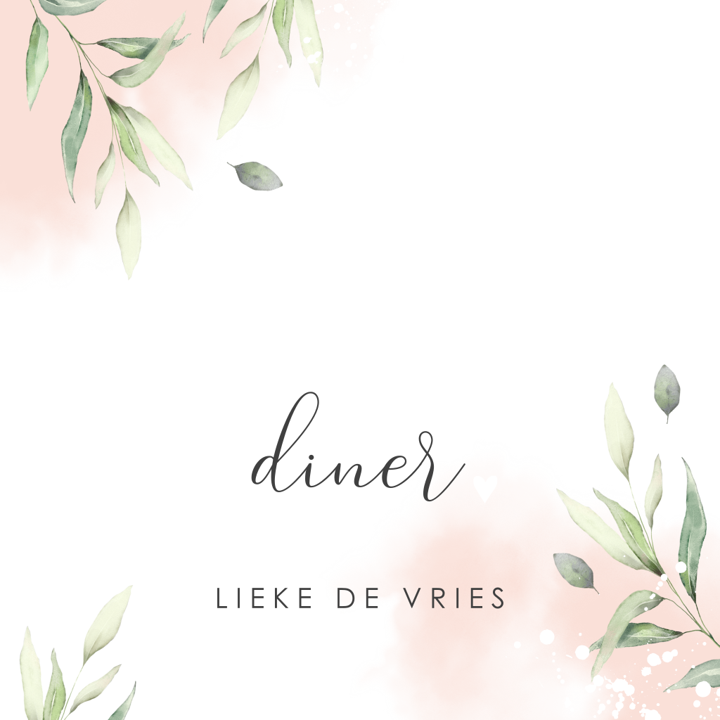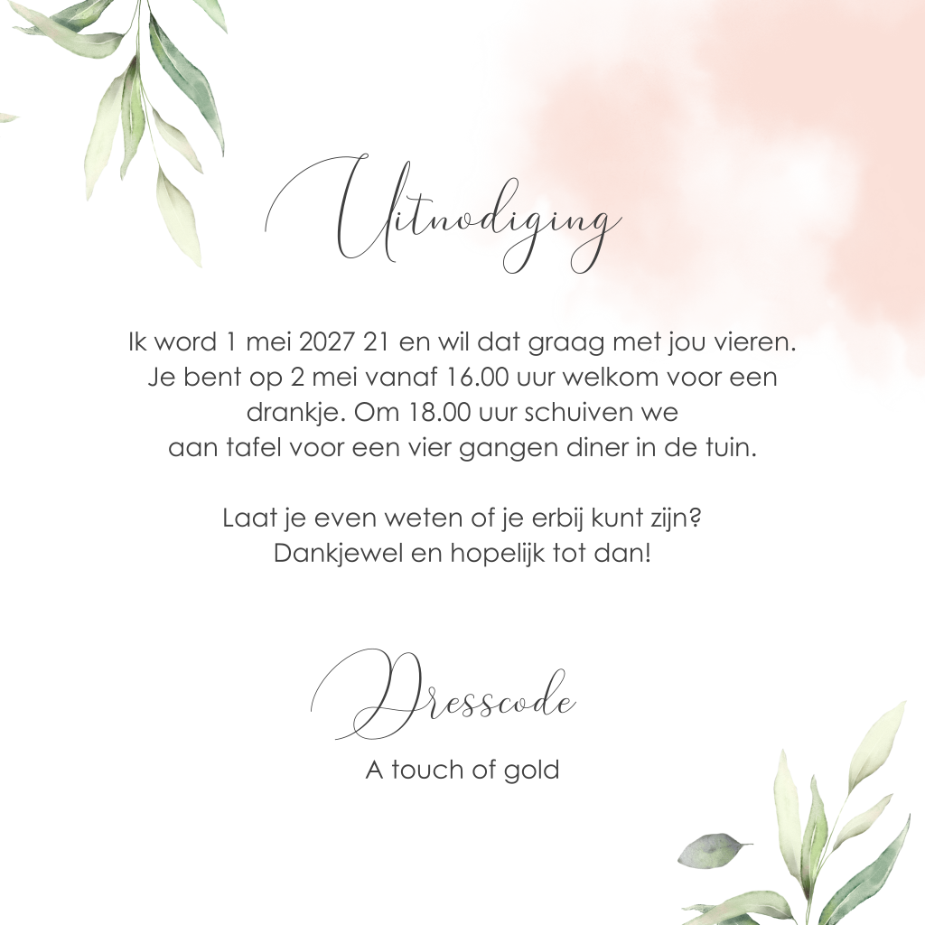 Op zoek naar een stijlvolle uitnodiging voor jouw 21 diner? Deze roze uitnodiging is versierd met groene bladeren en goudfolie spetters en heeft hierdoor een dromerige uitstraling. Met grote dikke cijfers staat het getal 21 in het midden van de kaart. In de kaart is ruimte voor een leuke foto en kun je natuurlijk alle informatie van je feestje kwijt. Je kunt de kaart personaliseren doordat je de waterverf gemakkelijk van kleur kunt veranderen. Zijn de aanpassingen naar wens? Bestel dan een drukproef om je ontwerp in het echt te bekijken.
