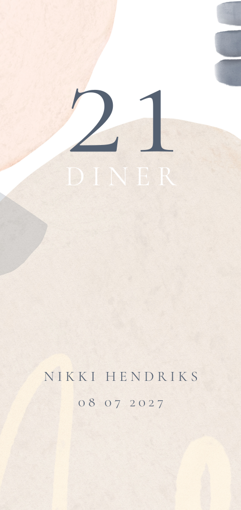 Een chique uitnodiging voor je 21 diner met pastel verfvlekken. De voorzijde wordt bedrukt met een zachte achtergrond van abstracte verfvlekken en op de achterkant komen deze terug. Pas de kaart naar wens aan in onze handige tool. Kom je er niet aan uit? Neem dan gerust contact met ons op, we helpen je graag.