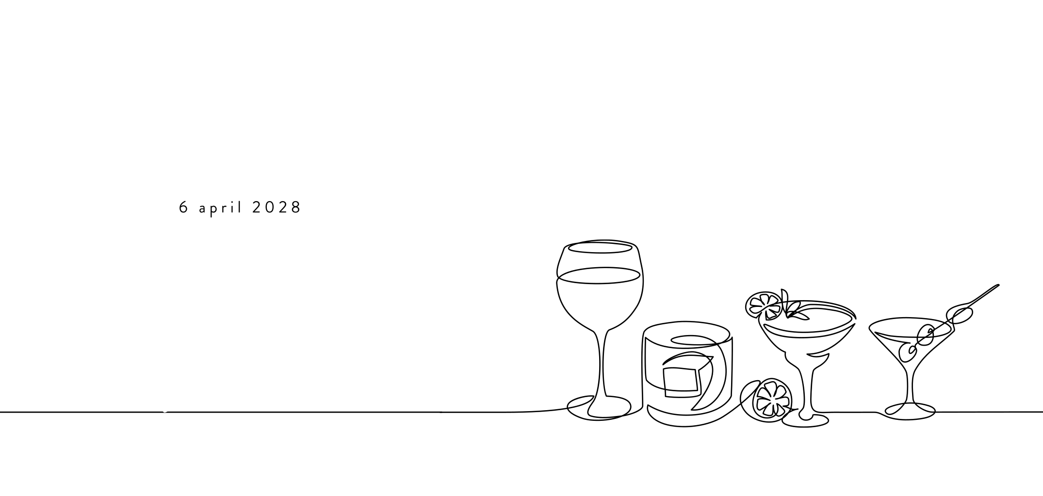 Een stijlvolle, langwerpige kaart met een zwarte lijntekening van cocktails, goudfolie spetters en speelse typografie. Op de achterzijde kun je een foto plaatsen in het polaroid kadertje. Een chique uitnodiging voor je 21 diner of een leuke borrel. De goudfolie spetters en typografie zorgen voor een uniek en trendy ontwerp.