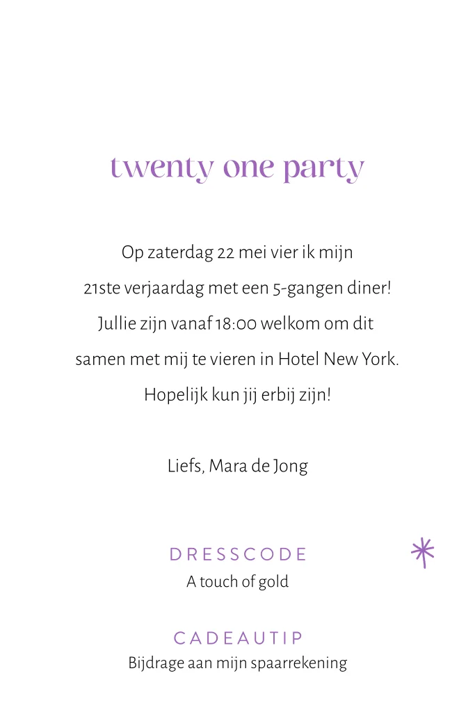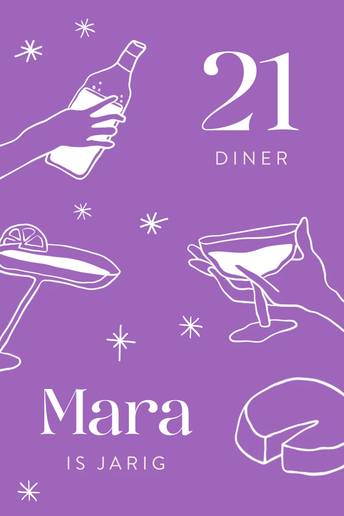 Wil je een hippe en stijlvolle uitnodiging voor jouw 21-diner? Dit paarse ontwerp met goudfolie straalt feestelijkheid uit met speelse illustraties van drankjes en sterren, perfect voor een gezellige avond. De kaart biedt ruimte om je naam toe te voegen, zodat je hem eenvoudig kunt personaliseren. Nodig je vrienden uit om samen deze bijzondere mijlpaal te vieren en maak van je 21e verjaardag een onvergetelijke avond vol sfeer en gezelligheid!