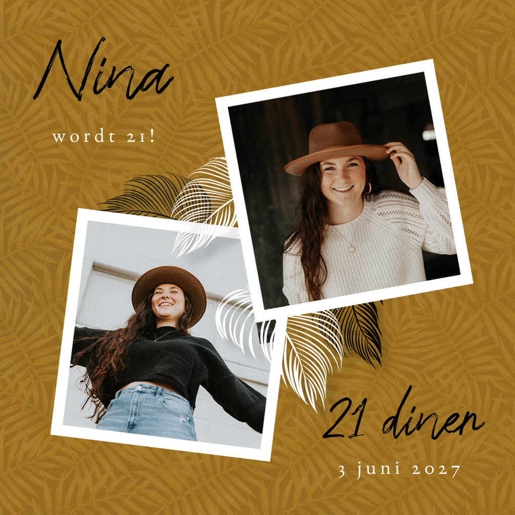 Een okergele uitnodiging met tropische bladeren en witte fotokaders voor een 21 diner. Plaats je eigen foto's in de kaders en pas eventueel de lettertypes aan. De witte en zwarte palmbladeren maken dit kaartje tot een zomers geheel. Een leuke kaart om al je vrienden uit te nodigen voor een tropisch 21 diner!