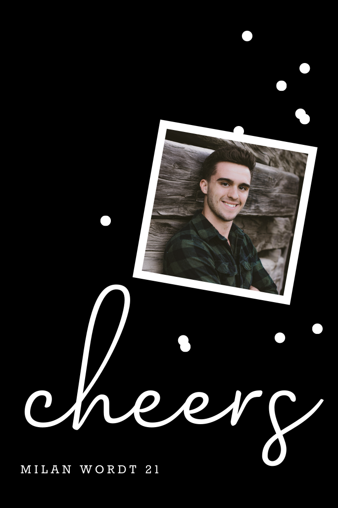 Nodig je vrienden uit met deze strakke uitnodiging met minimalistische opmaak. De uitnodiging heeft een zwarte achtergrond, witte speelse letters en een fotokader. Deconfetti is met zilverfolie gedrukt. Je kunt zelf in onze ontwerptool een eigen foto plaatsen en eventueel de lettertypes aanpassen.