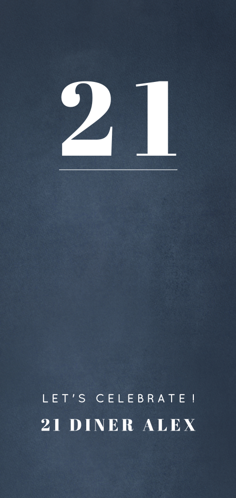 Nodig je vrienden uit voor je 21 diner met deze strakke uitnodiging met blauwe achtergrond en vetgedrukt lettertype. De eenvoudige opmaak zorgen voor een minimalistische kaart. Op de achterzijde kun je alle informatie kwijt over jouw 21 diner: de locatie, dresscode en je contactgegevens. Je kunt dit ontwerp naar eigen smaak aanpassen in onze ontwerptool.