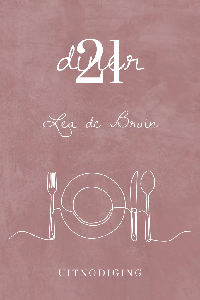 Deze stijlvolle uitnodiging voor een 21-diner heeft een minimalistisch ontwerp. De oudroze achtergrond straalt klasse uit, terwijl de typografische compositie bovenaan "21 diner" de aandacht trekt. Daaronder kun je je eigen naam plaatsen. Onderaan de kaart staat een lijntekening van een bord en bestek, uitgevoerd in luxe roségoudfolie, de culinaire sfeer van het evenement. Perfect voor een avond vol stijl en gezelligheid!