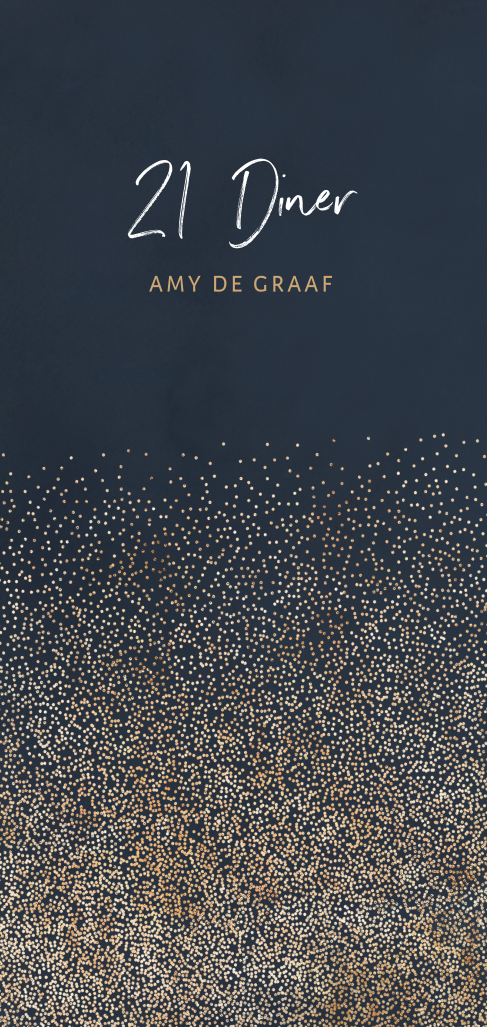 Op zoek naar een chique kaart voor je 21 diner? Ga dan voor dit donkerblauwe kaartje met goudkleurige stipjes en handgeschreven typografie. Met deze kaart verras je je vrienden en nodig je ze op een stijlvolle manier uit voor een mooi diner. Op de achterzijde van deze enkele kaart is genoeg ruimte om alle informatie over de viering te plaatsen. Benieuwd hoe deze kaart er in het echt uit komt te zien? Bestel dan een proefdruk.