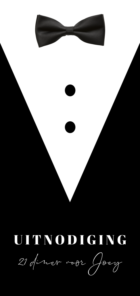 Uitnodiging met zwart pak en strikje voor 21 diner