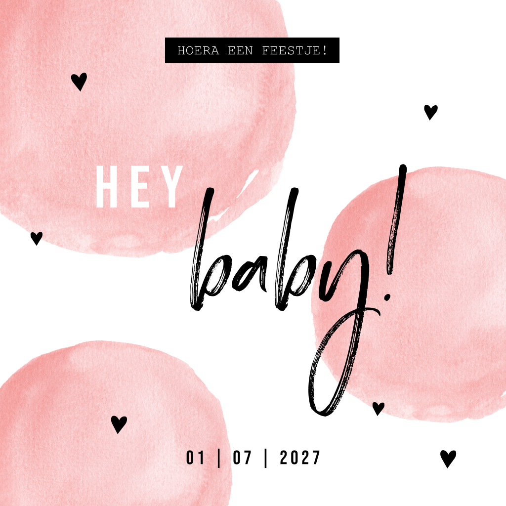 Is er een meisje op komst en moet er een babyfeestje georganiseerd worden? Nodig iedereen uit voor de babyshower met dit vrolijke kaartje! De kaart wordt versierd door roze waterverf stippen, zwarte hartjes en speelse typografie. Pas de lettertypes eventueel aan in onze handige ontwerptool.
