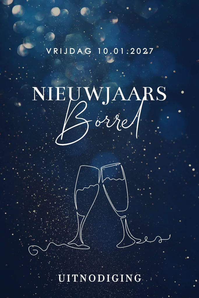 Begin het nieuwe jaar op een feestelijke manier met deze stijlvolle uitnodiging voor een nieuwjaarsborrel. De kaart straalt elegantie uit met een donkerblauwe achtergrond met sprankelende lichten en goudfolie accenten, die perfect passen bij de feestelijke sfeer van een bedrijfsborrel. Het ontwerp met twee klinkende champagneglazen in goudfolie gedrukt staat voor de viering van het nieuwe jaar.