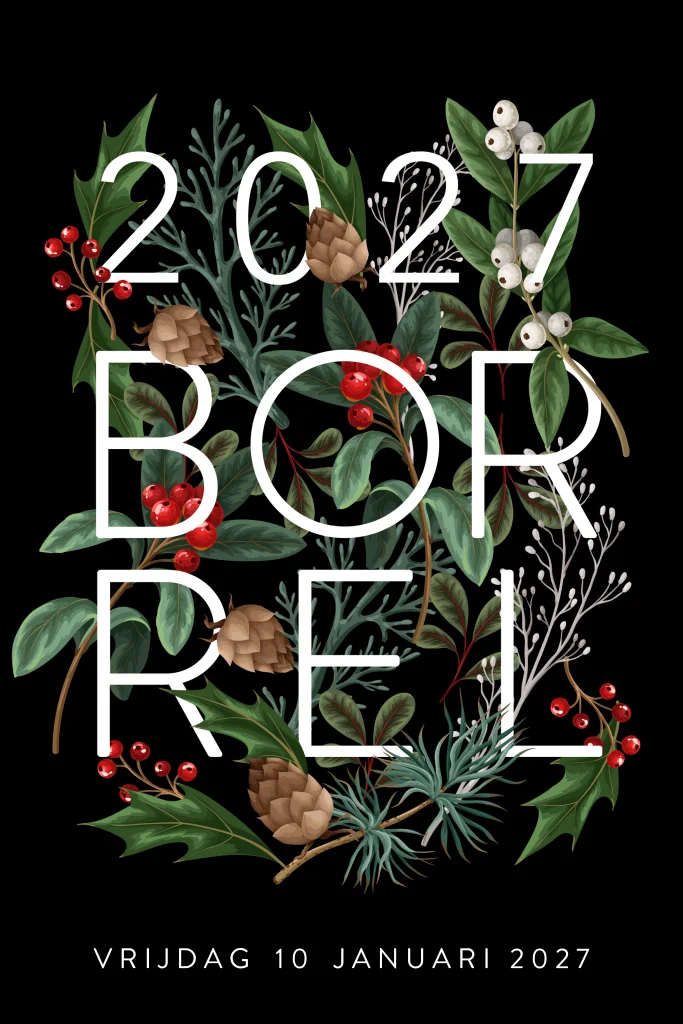 Vier de start van het nieuwe jaar in stijl met deze prachtige uitnodiging voor een nieuwjaarsborrel. Het zwarte ontwerp benadrukt de natuurlijke elementen, zoals dennenappels, takjes en rode bessen, die de kaart een chique en winterse uitstraling geven. De moderne typografie van "2027 BORREL" springt eruit en maakt meteen duidelijk wat de gelegenheid is. Perfect voor zowel zakelijke als privé-nieuwjaarsborrels.