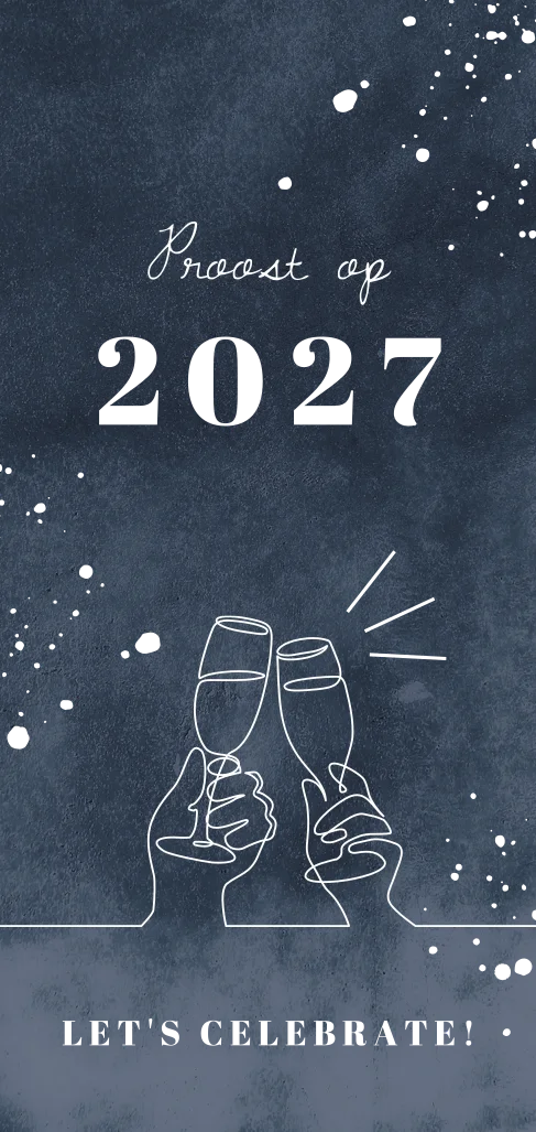 Deze stijlvolle uitnodiging voor het vieren van de jaarwisseling 2027 is perfect om een feestelijke toast uit te brengen op het nieuwe jaar. Het ontwerp heeft een donkerblauwe achtergrond met proostende champagneglazen in goudfolie. De tekst "Proost op 2027" in grote, gouden letters springt direct in het oog en nodigt uit om samen het glas te heffen.