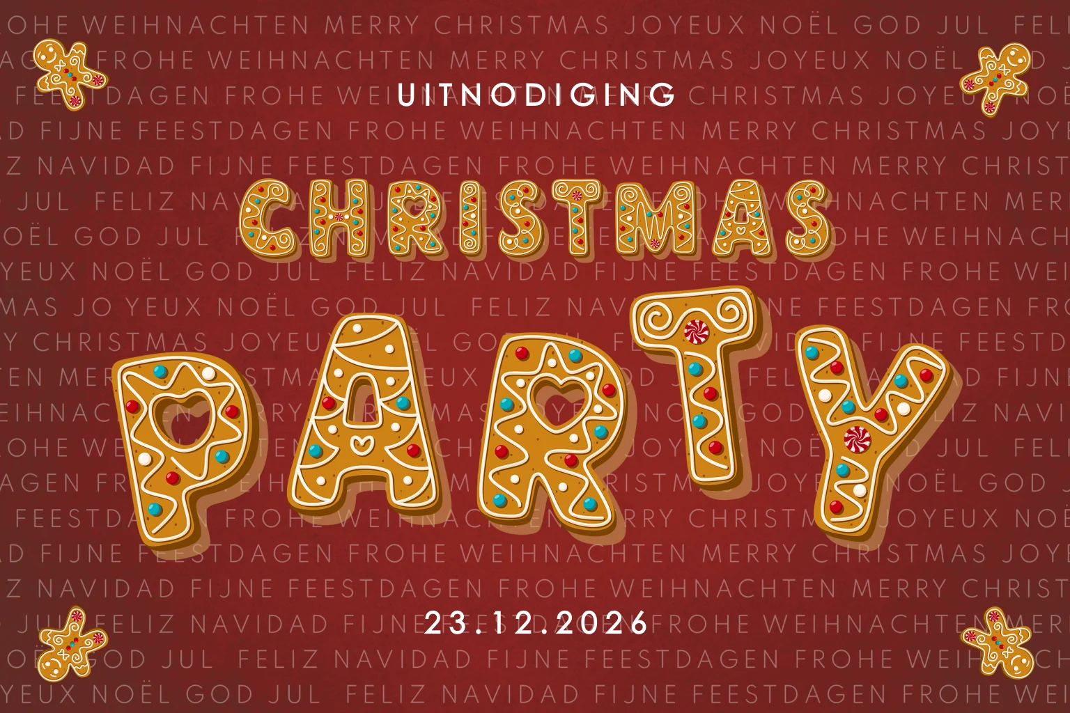 Breng de kerstsfeer tot leven met deze vrolijke uitnodiging voor jouw Christmas Party! Het speelse ontwerp, met letters in de vorm van heerlijke kerstkoekjes, straalt warmte en gezelligheid uit. De dieprode achtergrond bevat verschillende internationale kerstgroeten, wat deze kaart ideaal maakt voor een feest met een diverse groep gasten. De uitnodiging ademt een feestelijke sfeer uit en is perfect voor zowel zakelijke kerstborrels als gezellige familie- en vriendenbijeenkomsten.