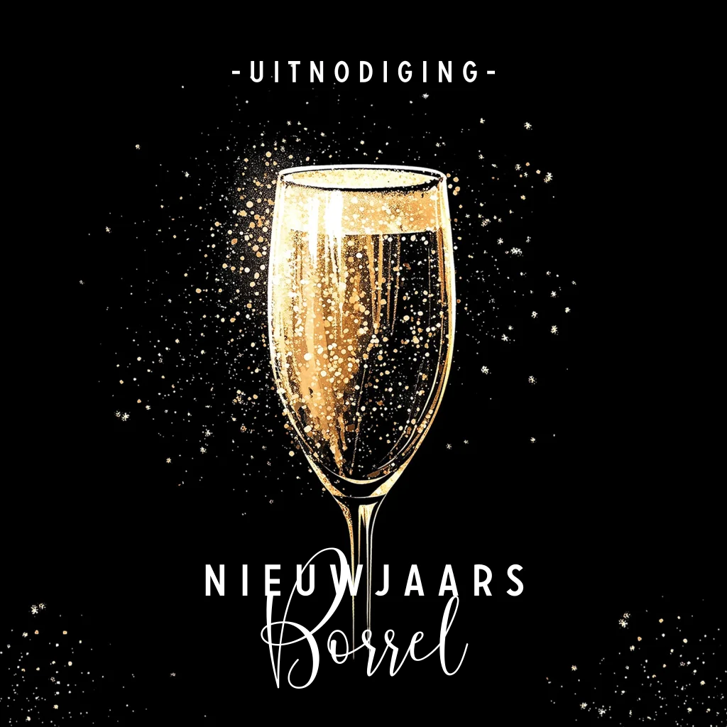 Zet het nieuwe jaar stijlvol in met deze elegante uitnodiging voor een nieuwjaarsborrel. Het strakke zwarte design wordt prachtig geaccentueerd door een sprankelend champagneglas, gevuld met gouden bubbels, wat een gevoel van luxe en feestelijkheid oproept. De uitnodiging heeft een minimalistische maar glamoureuze uitstraling, perfect voor een formele of stijlvolle nieuwjaarsviering.