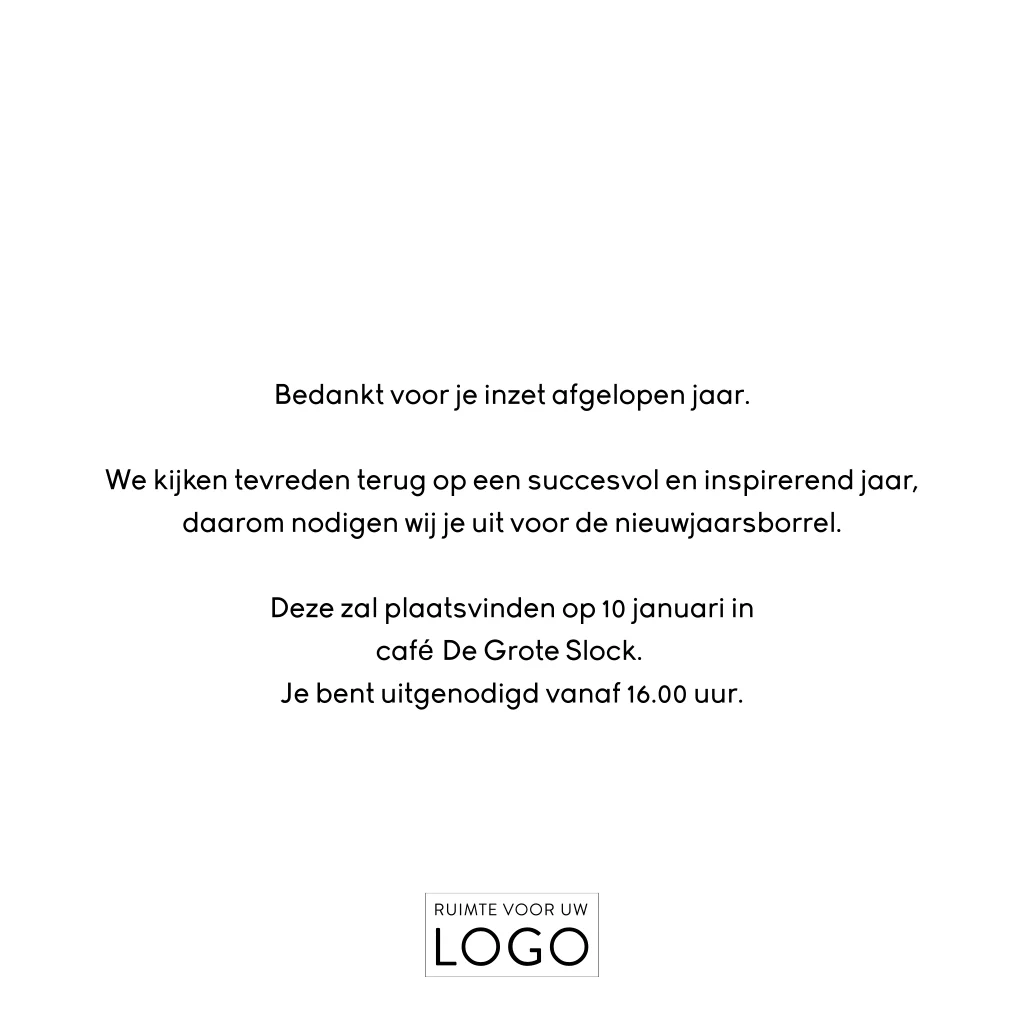 Of je nu een bedrijfsevenement of een feest met vrienden organiseert, deze uitnodiging straalt klasse uit en zorgt ervoor dat je gasten zich speciaal voelen. Voeg een persoonlijke boodschap toe en maak je nieuwjaarsborrel onvergetelijk.