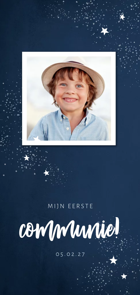 Op zoek naar een mooie uitnodiging voor de eerste communie van je zoontje? Ga dan voor dit donkerblauwe ontwerp met goudfolie sterretjes, eigen foto en speelse typografie. Een stijlvolle uitnodiging om te versturen naar alle vrienden en familie. Liever een ander lettertype of de achtergrond veranderen? Dat kan! Gebruik onze ontwerptool om je eigen draai aan dit kaartje te geven.
