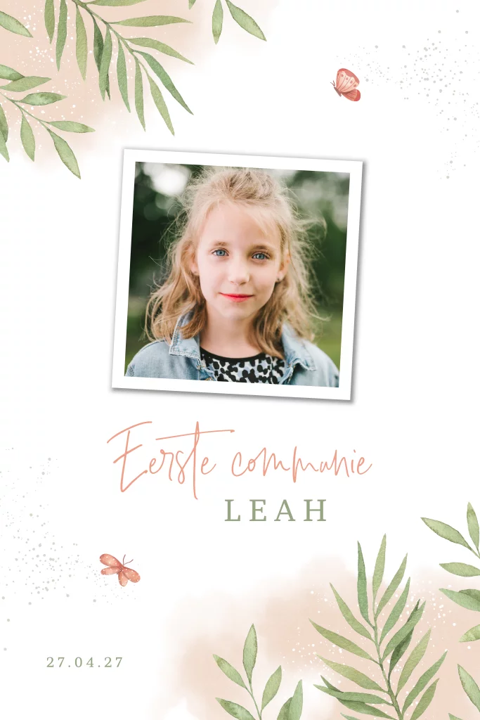 Verstuur dit botanische kaartje naar alle vrienden en familie om ze uit te nodigen voor de eerste communie van je dochter. De kaart wordt versierd met zachtroze waterverf, blaadjes, vlindertjes en sierlijke typografie. Op de voorzijde kun je een foto van je dochtertje plaatsen. Liever een ander lettertype of de kleur van de tekst veranderen? Pas dit kaartje aan in onze ontwerptool.
