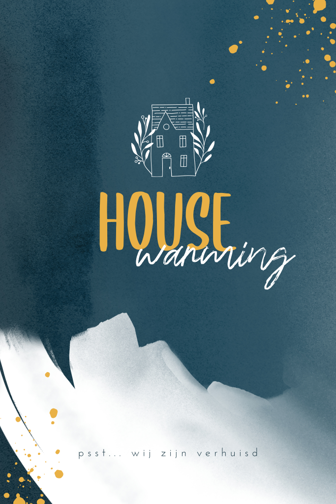 Blauwe housewarmingskaart met witte verf en huisje