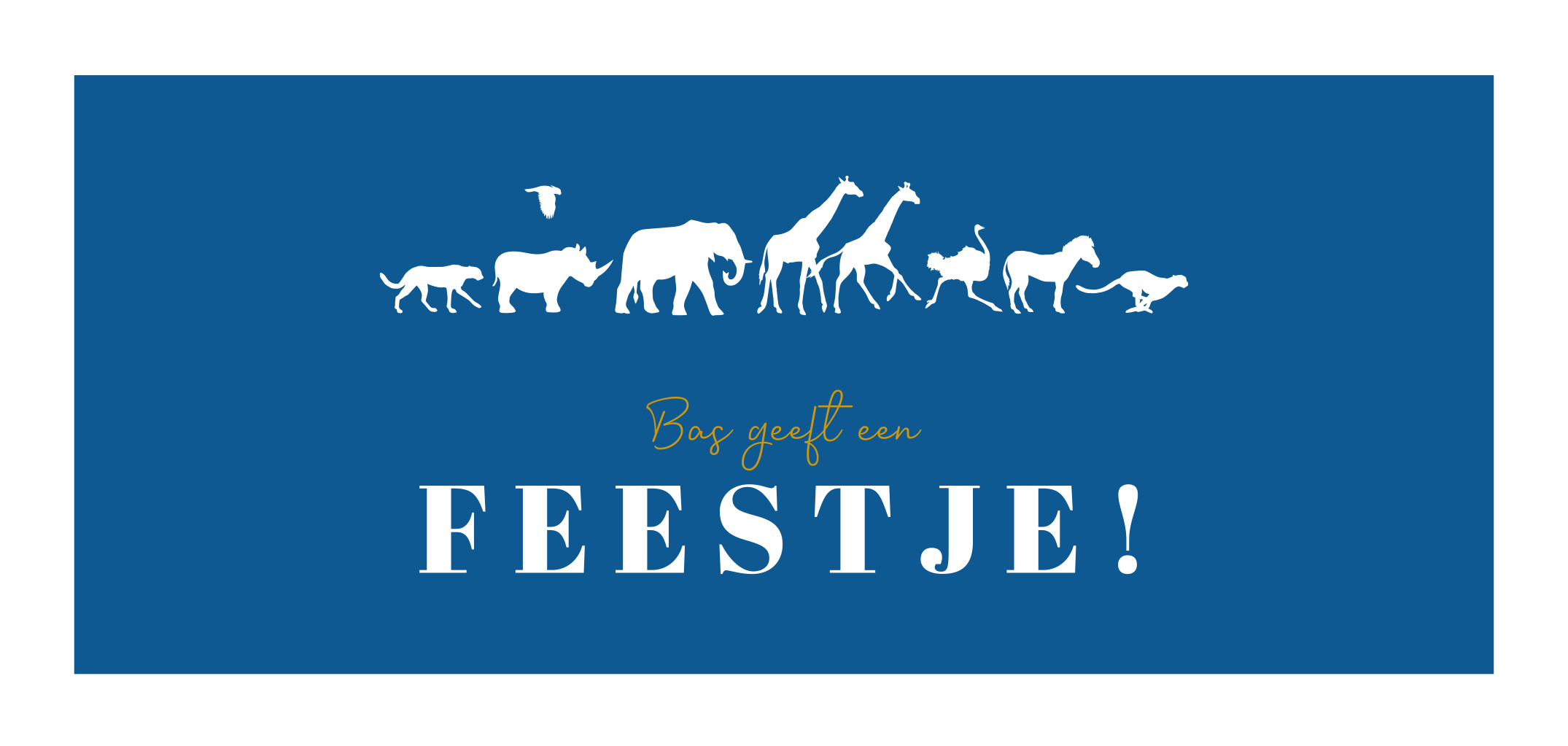 Een leuke uitnodiging in donkerblauwe kleur met een rij wilde dieren voorop. Een vrolijke kaart om iedereen uit te nodigen voor een verjaardagsfeestje met dieren of jungle thema. Een giraf, olifant, neushoorn, luipaard en vogel komen terug op de achterkant. Pas eventueel de kleuren en lettertypes aan in onze handige ontwerptool.