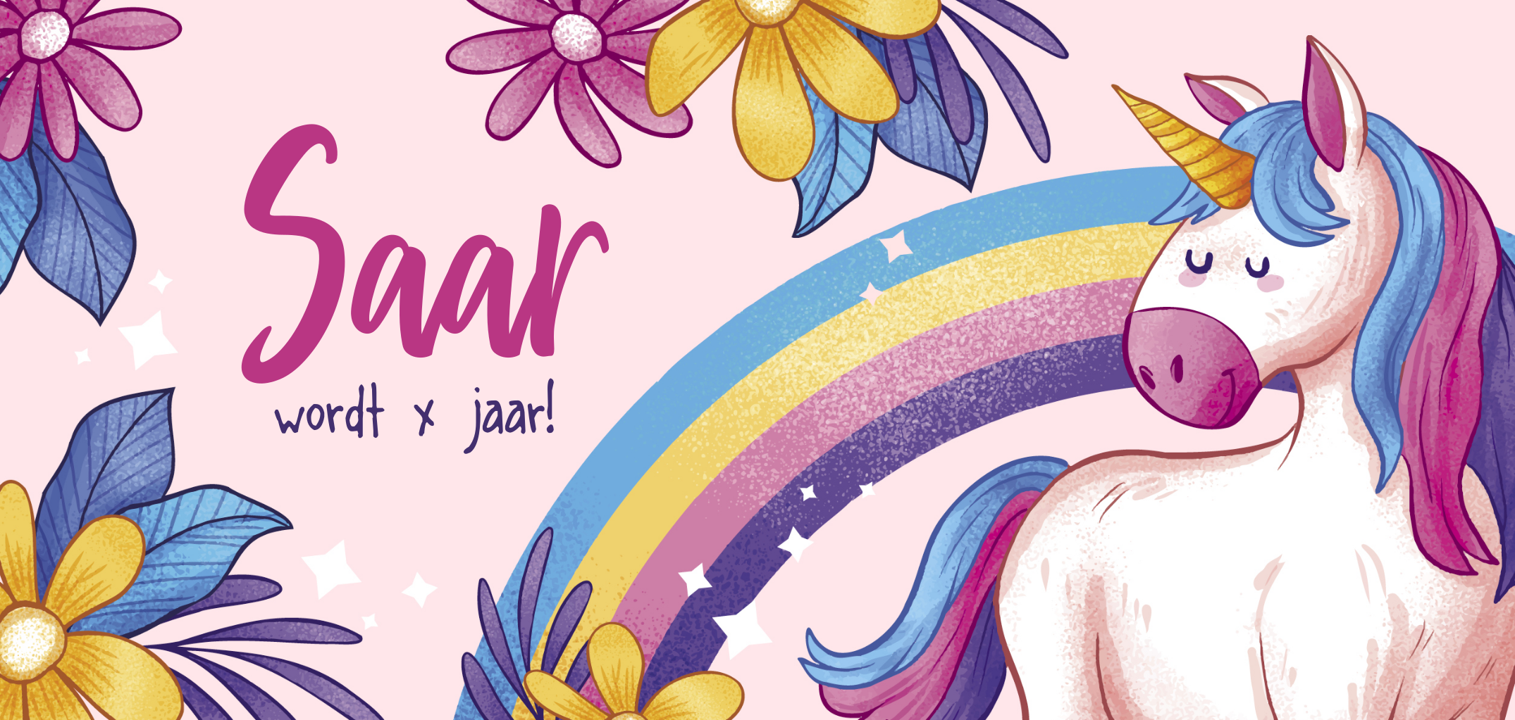Is jouw kind dol op unicorns en regenbogen? Dit kleurrijke kaartje is dan de perfecte uitnodiging voor een verjaardagsfeestje! De kaart wordt verder versierd met bloemen en kleine, witte sterretjes. Een vrolijke en sprankelende uitnodiging! Pas eenvoudig zelf de teksten aan in onze ontwerptool.