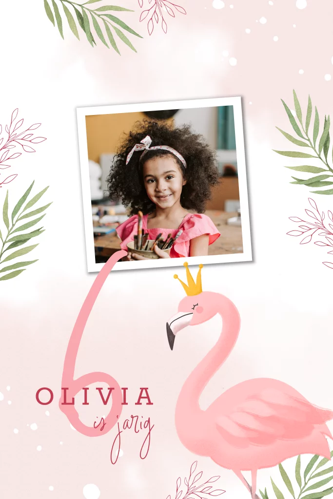 Is je dochtertje binnenkort jarig en viert ze een feestje? Nodig al haar vriendjes en vriendinnetjes uit met dit roze kaartje met flamingo, foto en bladeren. De spetters en lichtroze waterverf vlekken maken het helemaal af! Een vrolijke uitnodiging voor ieder meisje dat dol is op roze en flamingo's!