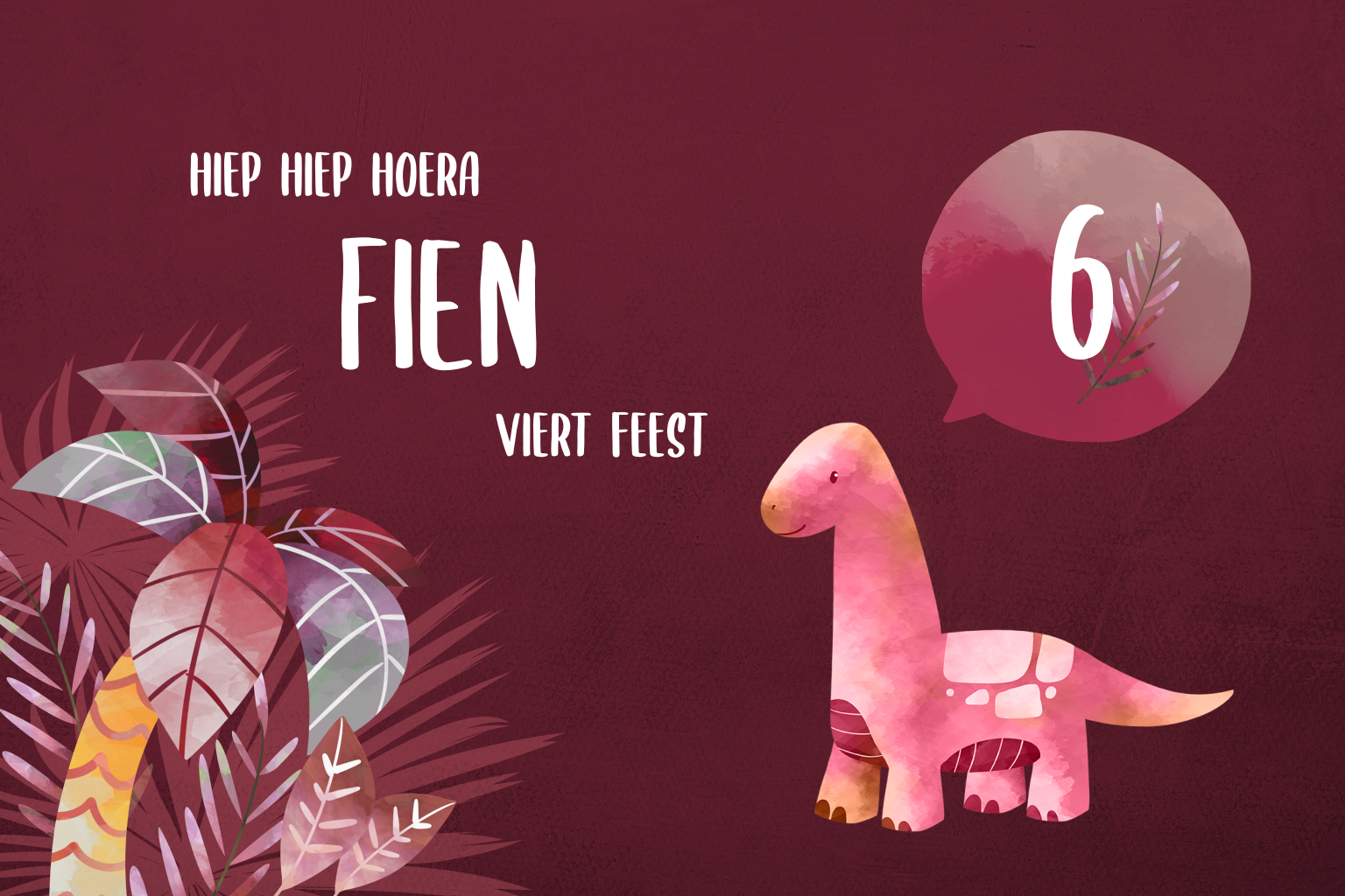 Donkerroze uitnodiging kinderfeestje met roze dino en bladeren