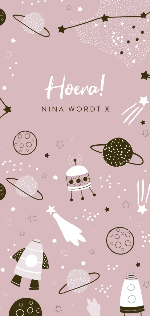 Viert je dochtertje binnenkort haar verjaardagsfeestje en heeft deze een ruimte thema? Dan past deze roze uitnodiging met raket, sterretjes en planeten perfect! Op de achterzijde van dit langwerpige kaartje is ruimte voor een foto van je dochtertje. Pas deze uitnodiging eventueel aan in onze ontwerptool.